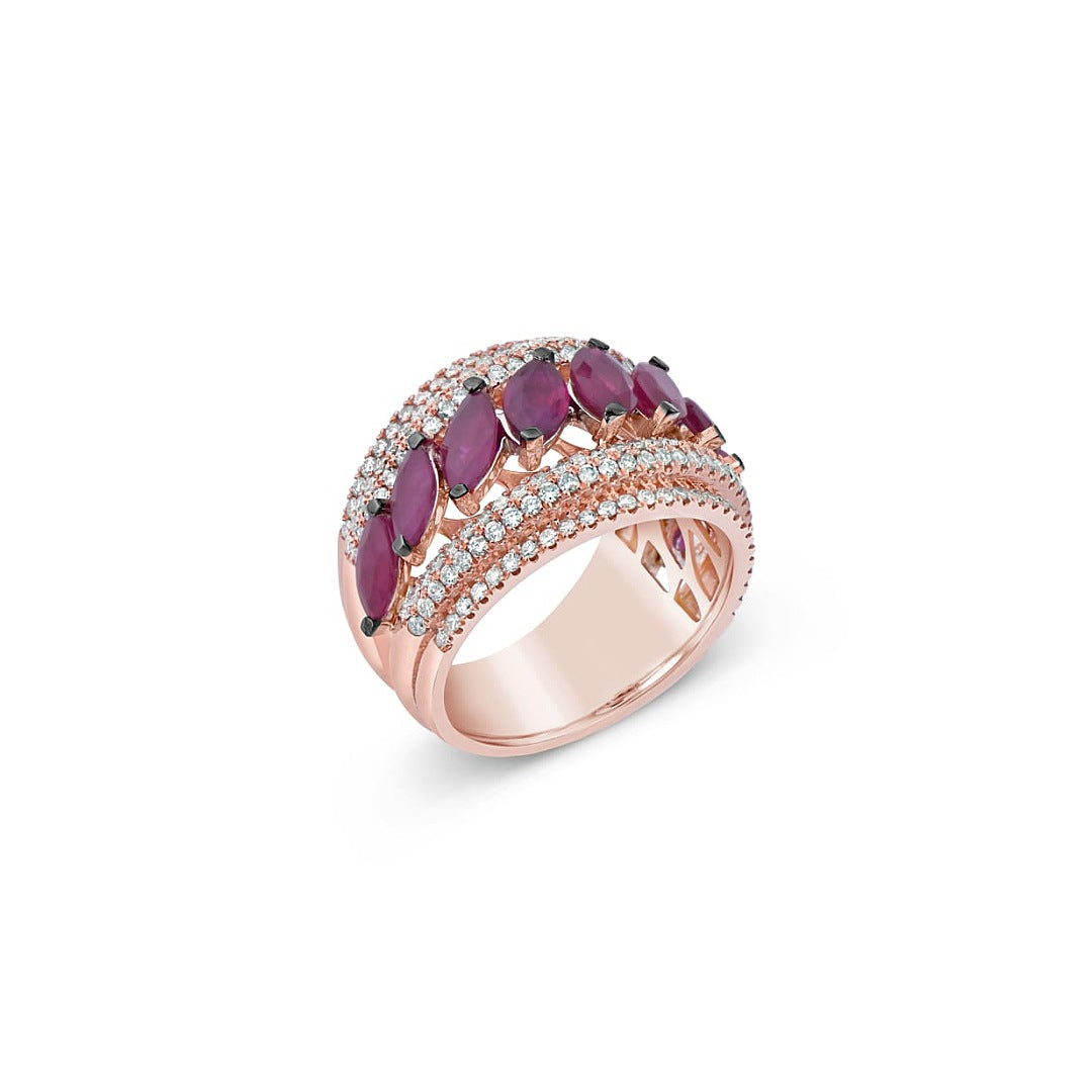 A regal statement of color and brilliance. The Rouge Royale Ring features 3.42 ct of vivid marquise-cut rubies set in a sweeping, multi-row design, elevated with 1.05 ct of pavé-set diamonds for unmistakable sparkle. Crafted in 18K rose gold, its sculptural silhouette blends opulence with refined femininity, making it a standout piece for evening elegance, special celebrations, and glamorous occasions.